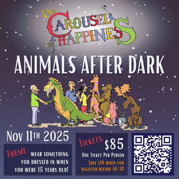 All proceeds from the event (including ticket sales, auction sales, and donations) support the maintenance of our 1910 Looff carousel mechanism, our menagerie of contemporary animals, our 1913 Wurlitzer band organ, and our mission to promote happiness, well-being, and service to others through stories and experiences.